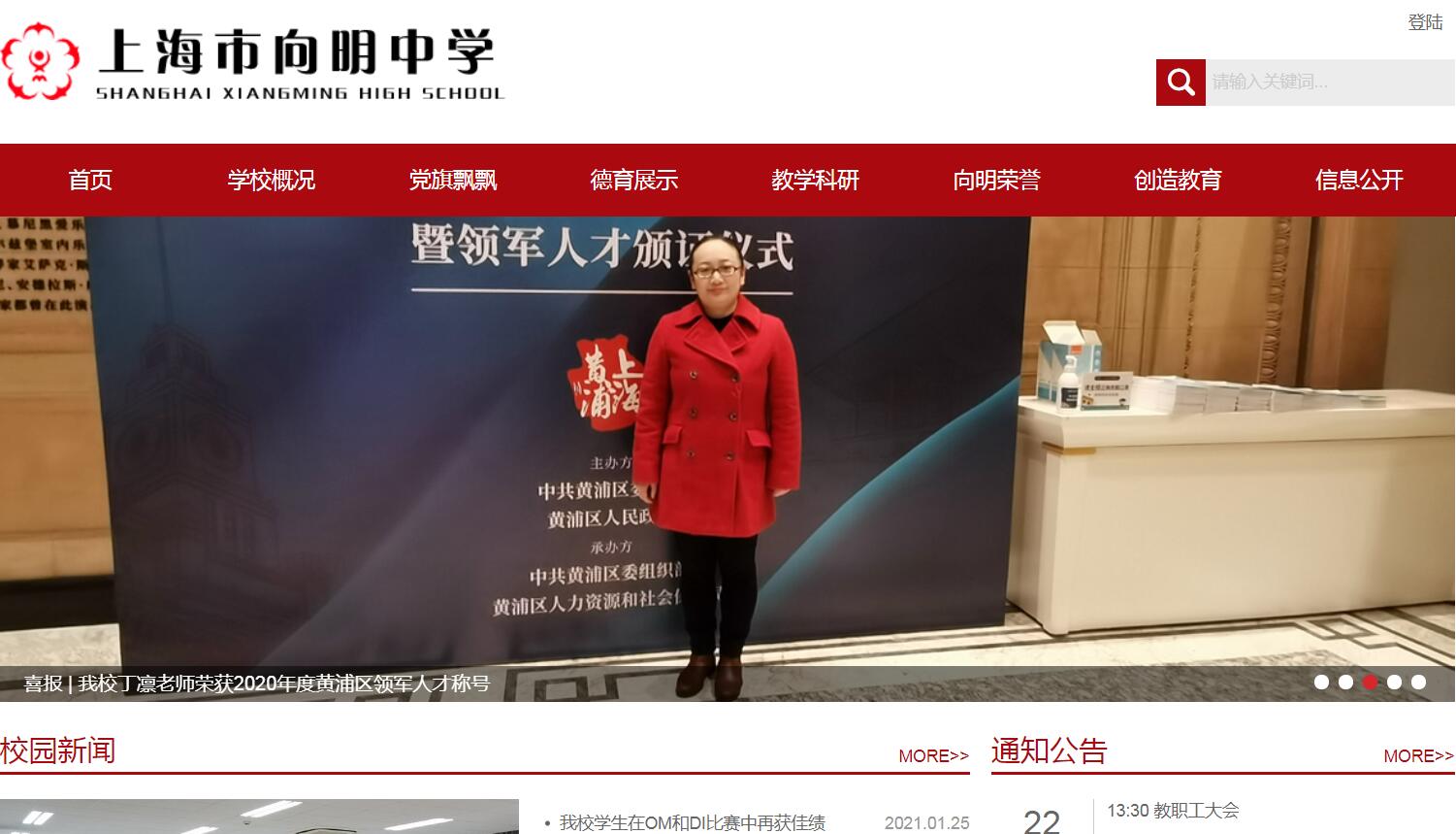 沪上百年名校向明中学由著名爱国教育家马相伯先生于1902年创建,1959年被命名为上海市重点中学。2005年被上海市教委命名为首批“上海市实验性示范性高中”。2009年9月,向明中学在闵行区浦江镇设立浦江校区,学校形成横跨黄浦江两岸的“一校两区”办学格局,共同延续向明创造教育办学特色。2017年以向明为龙头,成立向明教育集团。