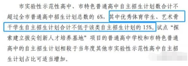 市实验性示范性高中和市特色普通高中的自主招生计划数合计不超过全市普通高中招生计划总数的6%,面向全市范围内有创新潜质、学科专长、体育或艺术特长的初中毕业生。其中优秀体育学生、艺术骨干学生自主招生计划合计不低于该类自主招生计划的15%(即6%*15%)。