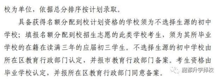 先看黄色圈出来的部分:名额分配到校计划资格的学校须是不选择生源的初中。那么就是说选择生源的民办初中 2022 届和 2023 届应届毕业生,可参加自主招生录取、名额分配到区招生录取以及统一招生录取,但不能参加名额分配到校招生录取。