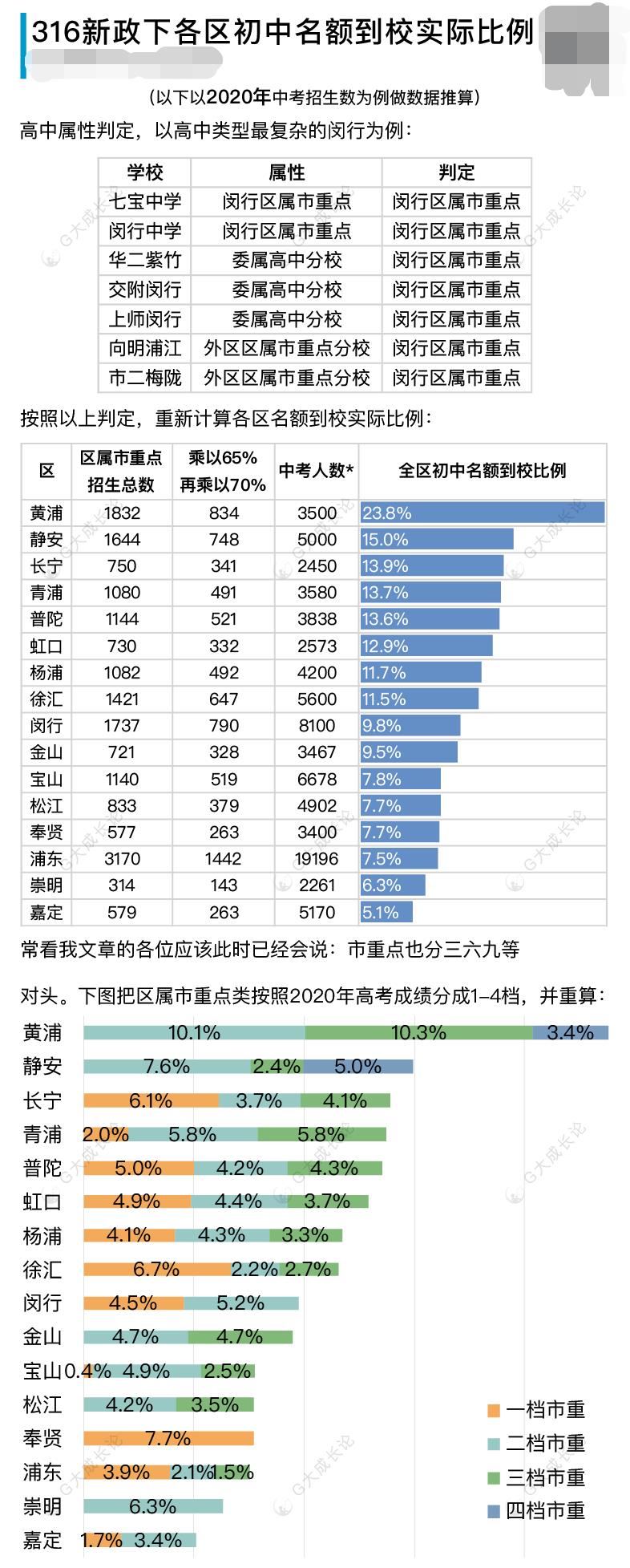 一档市重名额分配到初中比例最高的依次是奉贤、徐汇、长宁