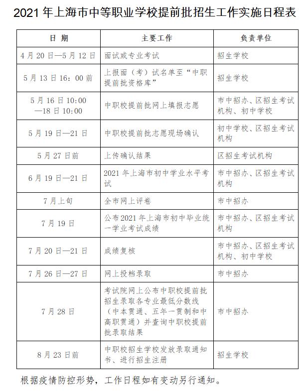 2021上海中考日程表<查分、分数线公布、录取时间都有> 2021/4/15 11:49:02 上海中考网 人气: 标签:中考 2021年上海初中毕业统一学业考试时间安排 2021年上海市高中阶段学校考试招生工作日程表 2021中等职业学校提前批招生工作实施日程表 2021全日制普通中等职业学校自主招收来沪人员随迁子女工作日程表