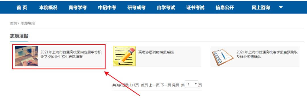 2.在“志愿填报”栏目下,可以看到“2021年上海市普通高校面向应届中等职业学校毕业生招生志愿填报”。