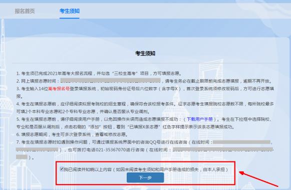 6.仔细阅读考生须知中的相关内容。阅读完毕后,勾选“我已阅读并知晓以上内容(如因未阅读考生须知和用户手册造成的损失,由本人承担)”,并点击“下一步”按钮进入填报页面。