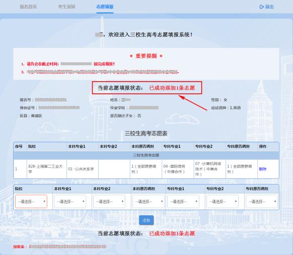 8.界面显示红色“已成功添加1条志愿”,表示该条志愿填报成功。如下图所示(图片内容仅供参考):