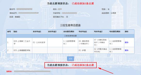 9.再次选择其他院校、专业,点“添加”按钮,看到红色“已成功添加2条志愿”字样表示该条志愿填报成功。最多可填报2条院校志愿,每条院校志愿最多可选择2个本科专业和2个专科专业。志愿数达到2条时,不允许继续添加。如下图所示(图片内容仅供参考):