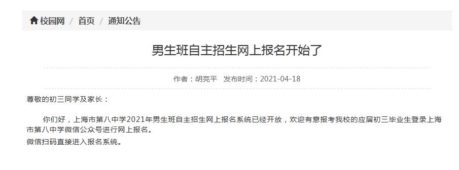 根据上海市教委统一要求,我校2021年提前批招生网上报名系统开通时间为:4月18日8:00起,至5月8日10:00止。