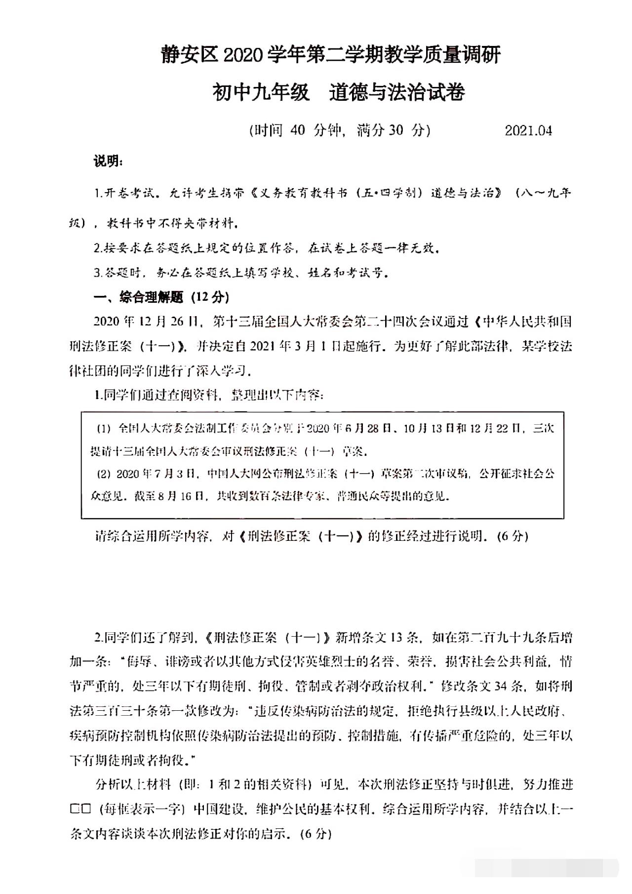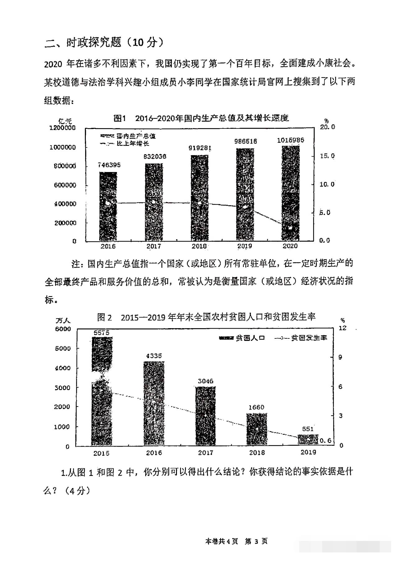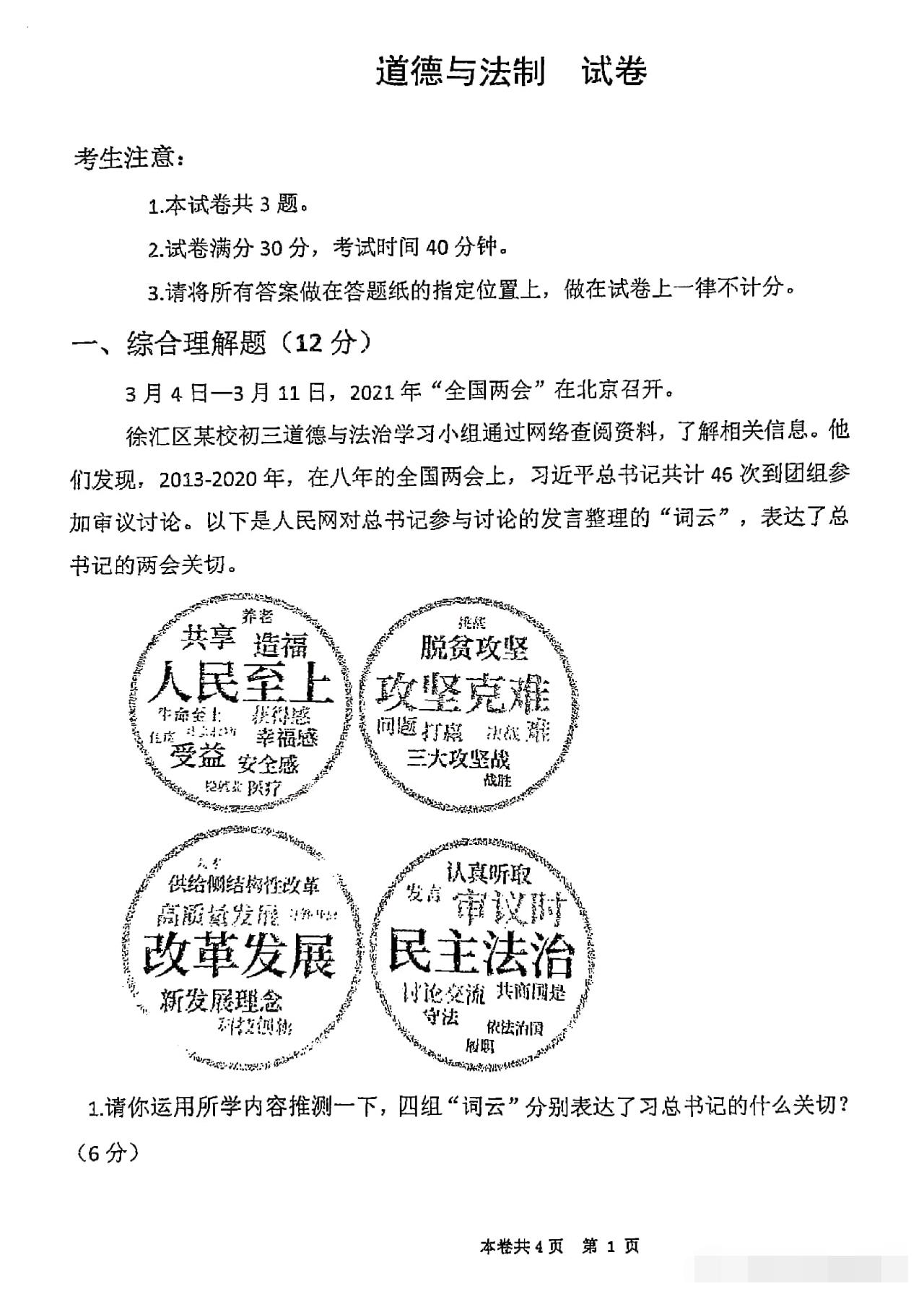 从卷面上看,全卷共有三道综合题,分别为综合理解题、时政探究题和案例分析题,满分30分。