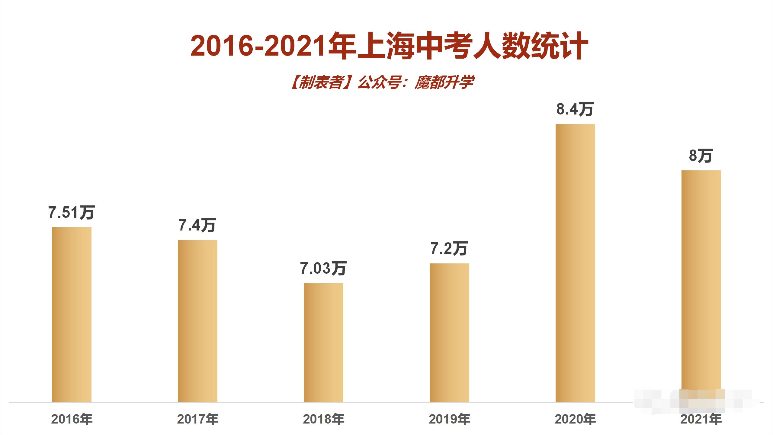 2021年上海各区中考人数出炉!浦东超2万人! 2021/4/27 13:51:41 上海中考网 人气: 标签:中考 2021上海各区中考人数统计 附上2016-2021年上海中考人数统计图: 2016-2019年上海中考人数比较稳定,一直保持在7万多人,分别为7.51万、7.4万、7.03万、7.2万。2020年则是迎来猛增,达到8.4万人。 2021年上海中考人数,官方公布为8万余人,再次突破8万大关。不过相比2020年有所减少,约4000人。