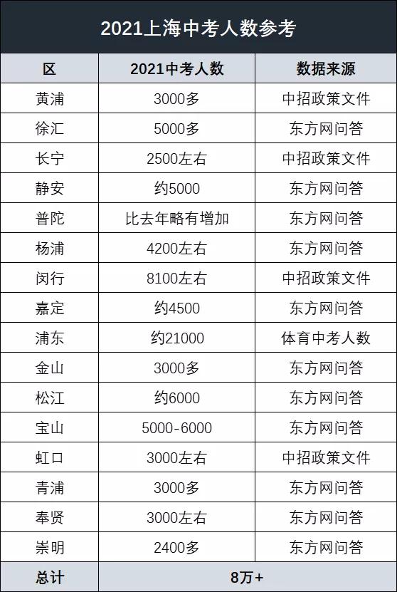 市教育考试院之前发布的文件中曾提到,今年上海有8万余学生参加中考,昨天各区教育局在回答考生和家长的提问时,也提到了各区的中考报名人数,不过因中考补报名尚未截止,目前只有大致人数,仅供参考。具体以实际参考人数为准!