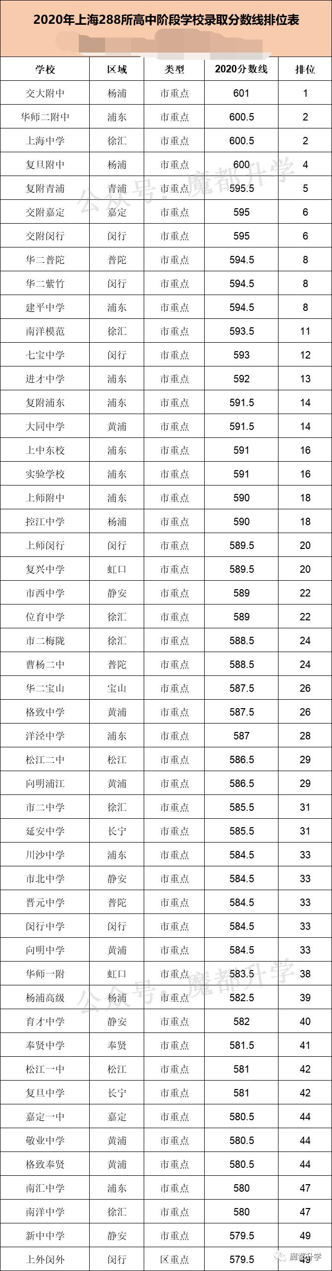 整理了2020年上海全市288所学校(含中本贯通)的录取分数线,制成排位表,方便大家参考查看!