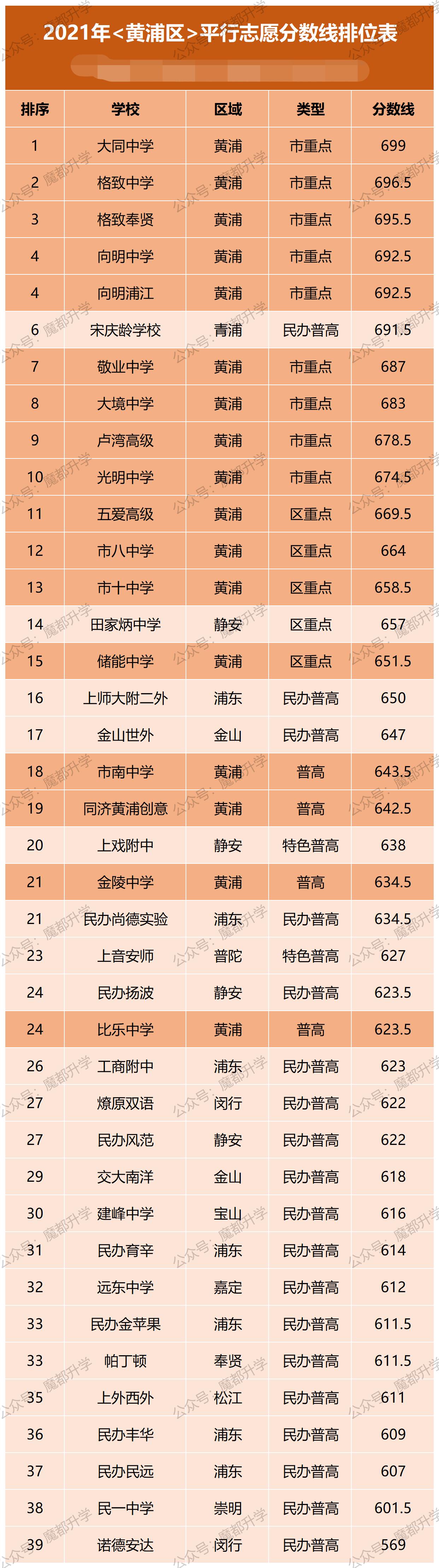 2021上海各区高中分数线排序表! 2021/8/26 13:01:47 上海中考网 人气: 标签:中考 今天就给大家安排上,2021年上海各区高中录取分数线排位表,方便大家了解各高中学校在本区的招生分数线。如果你是新初二、新初三的同学,强烈建议转发收藏本文,方便日后随时查看! 说明:下表中本区高中用了较深底色,外区高中用了较浅底色,便于大家识别。此外,下表分数线数据来源于各区官方发布。 黄浦区 徐汇区 长宁区 静安区 普陀区 虹口区 杨浦区 闵行区 宝山区 嘉定区 浦东新区 崇明区 奉贤区 青浦区 松江区 金山区