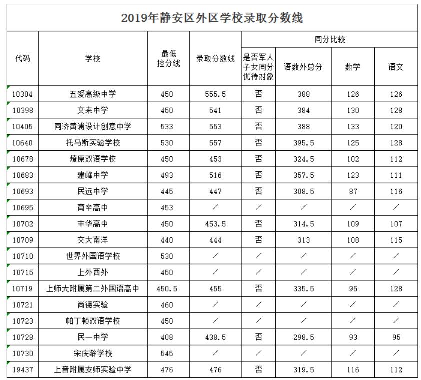 2019年静安区外区学校录取分数线