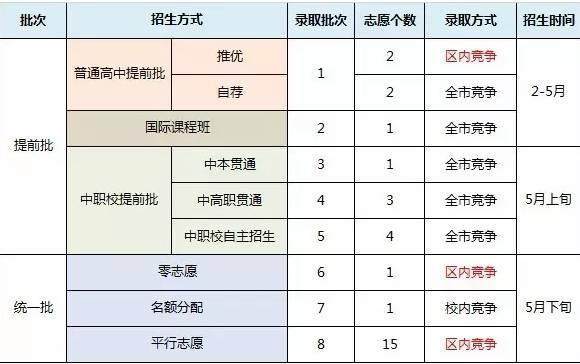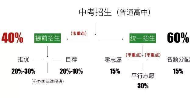 各招生方式的执行比例普通市重点高中的招生方式:40%自主招生+15%名额分配+15%零志愿+30%的平行志愿。